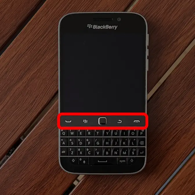 物理QWERTYキーボードの上にあるボタン群は、左から電話アプリアプリ履歴ポインティングデバイス戻るホームでした。