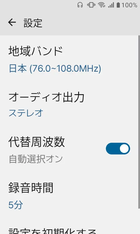 特に理由が無ければ地域バンドに日本(76.0~108.0MHz)が選択されていることを確認します。
