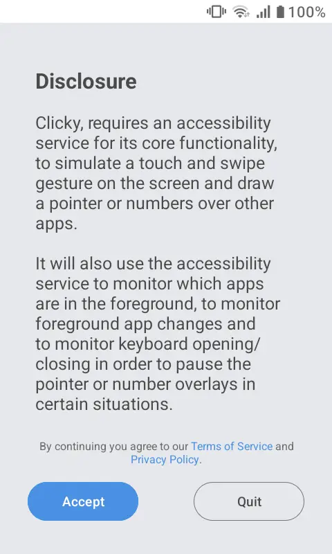 Clickyにデバイスのフルコントロールを許可しますか?と表示されたら許可をタップし、Clicky is readyよりNextをタップすれば完了です