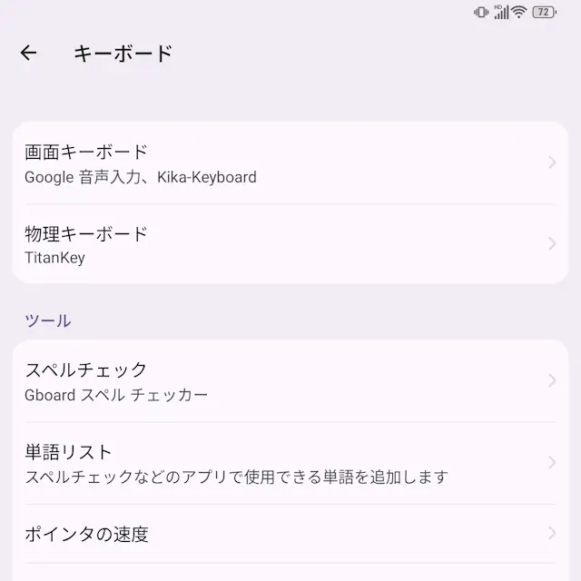 Titan 2ではキーボードアプリに[Kika-Keyboard]が選択されていますが、Googleが提供する【Gboard】に切り替えて使うこともできます。ただ、【画面キーボードの選択】や【キーストロークの設定を変更】した方が良いです。