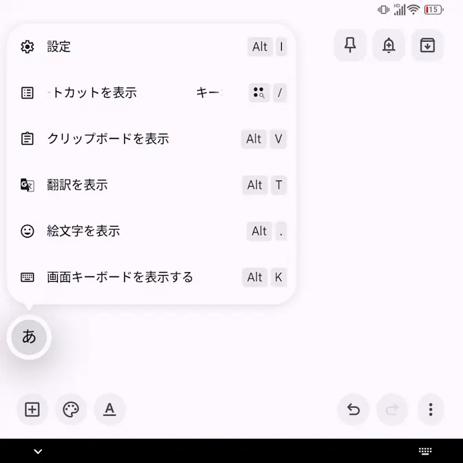 入力欄などをタップして表示されるあ/USをタップするとメニューが表示されます。