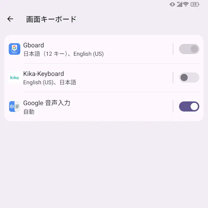 また、これによってデフォルトのKika-Keyboardが使いにくくなることから、これをオフにしてキーボードをGboardのみにすると使いやすくなります。