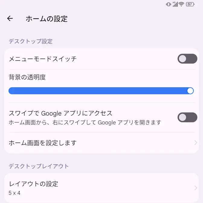 ホームの設定よりスワイプでGoogleアプリにアクセスをタップしてオフに切り替える(画像はオフの状態)と、一番左が1ページ目になります。