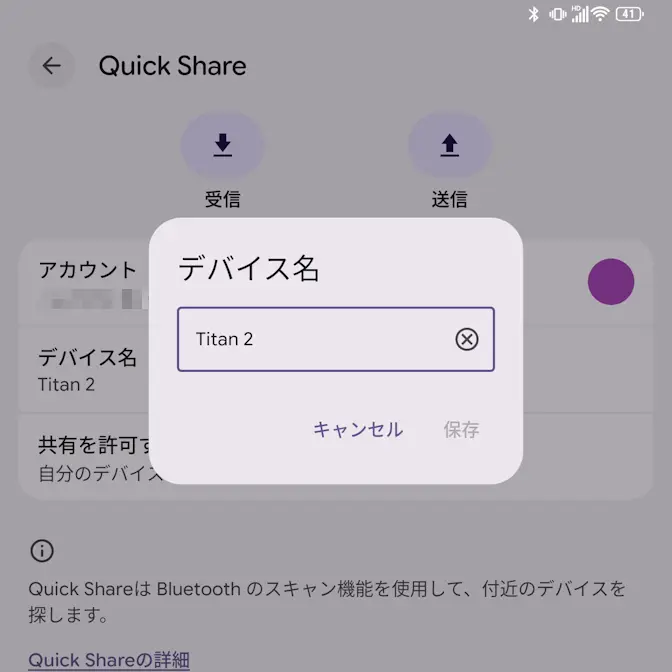 AndroidスマートフォンのTitan 2でBluetoothやQuick Shareを使うと、相手デバイスに[Titan 2]と表示されますが、これは【デバイス名】に登録されたデフォルトの名前であり変更することができます。