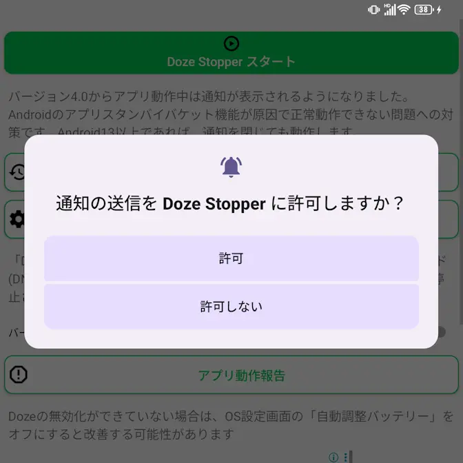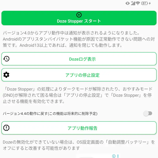 アプリよりDoze Stopperスタートをタップします。