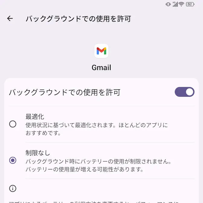 アプリのバッテリー使用量のバックグラウンドでの使用を許可|よりバックグラウンドでの使用を許可をオンに切り替え制限なしを選択します。