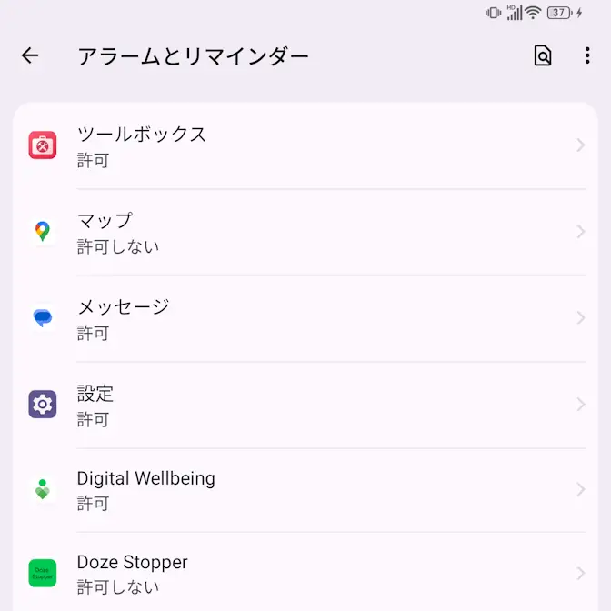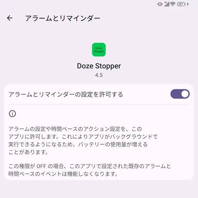 アラームとリマインダーのDoze Stopperよりアラームとリマインダーの設定を許可するをタップしてオンに切り替えます(画像はオンの状態)。