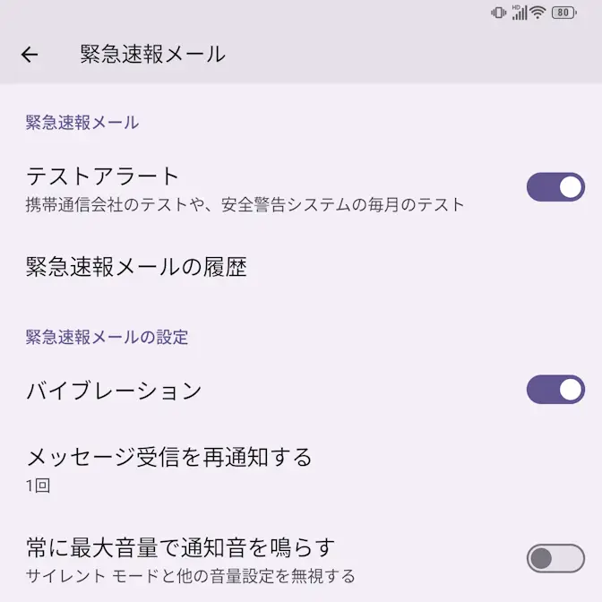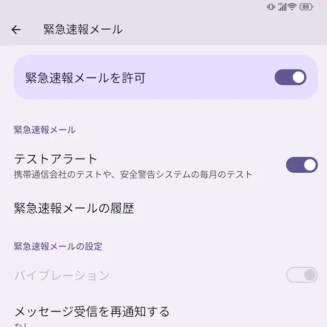 緊急速報メールより緊急速報メールを許可をタップしてオンオフを切り替え、任意でテストアラートメッセージ受信を再通知するも変更します(画像はオンの状態)。