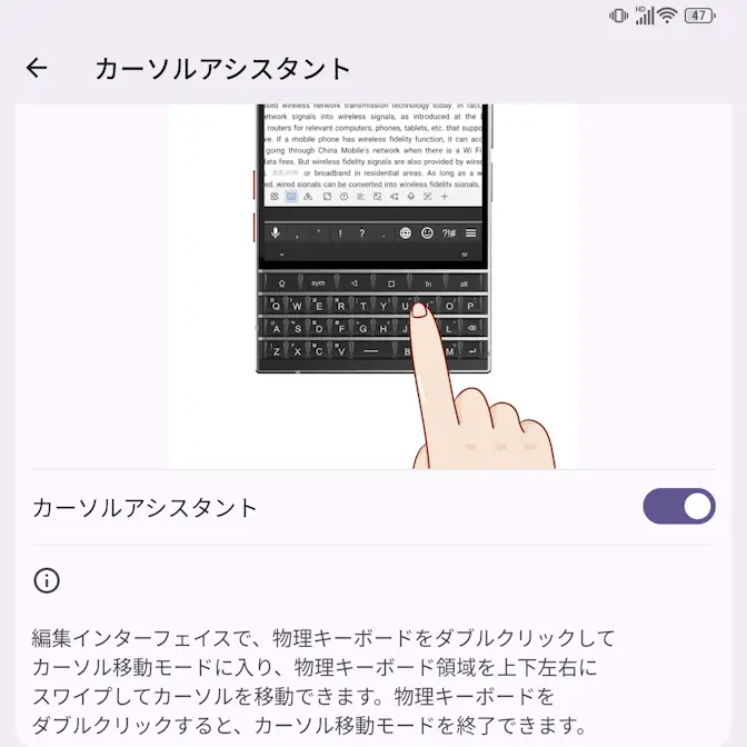 しかし、Titan 2にはQWERTY物理キーボードをタッチパッドのように指でスワイプすることでカーソルを上下左右に動かすことができ、これをカーソルアシストと呼びます。