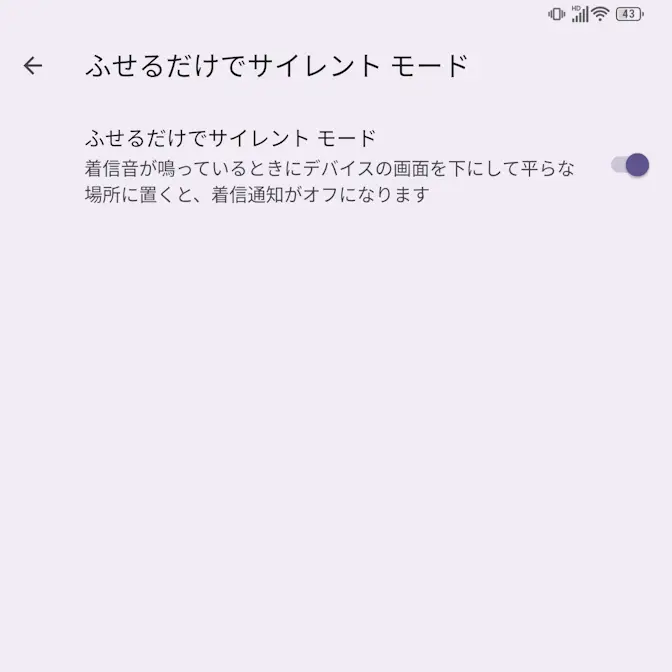 設定のふせるだけでサイレントモードよりふせるだけでサイレントモードをオンに切り替えます(画像はオンの状態)。