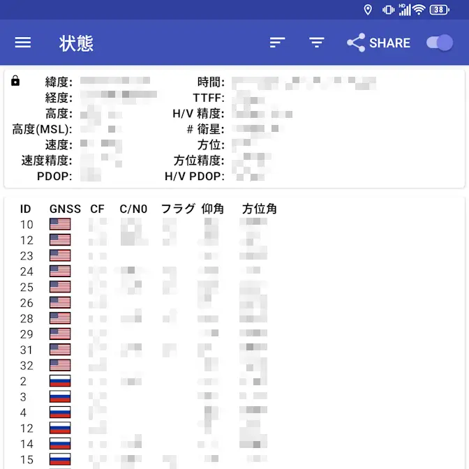 このため、カタログスペックではみちびき/QZSSに対応していないようですが、実際に「受信できない」のかGPSTestアプリを使って試してみました。