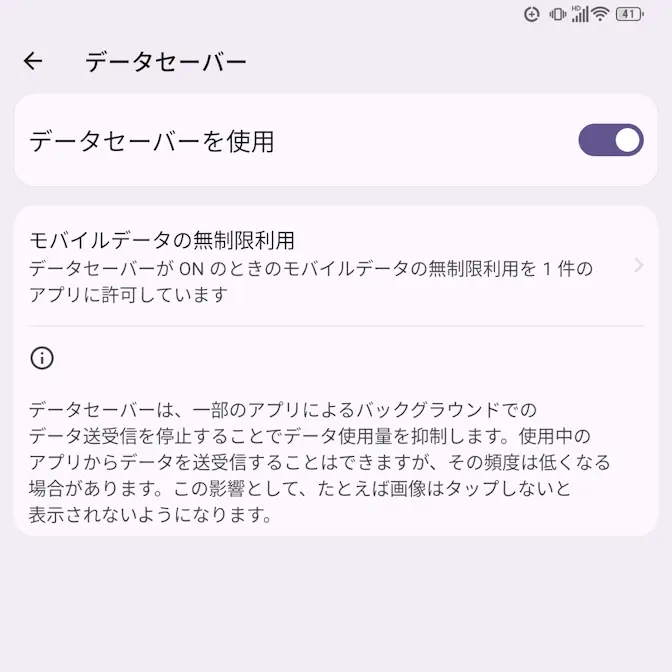 ただ、項目が異なるだけで、機能としては一般的なAndroidスマートフォンと同様にデータセーバーを使うことができます。