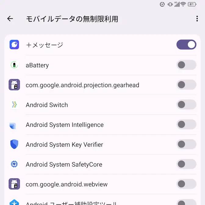 データセーバーのモバイルデータの無制限利用より対象のアプリをオンに切り替えます(画像は+メッセージがオンの状態)。