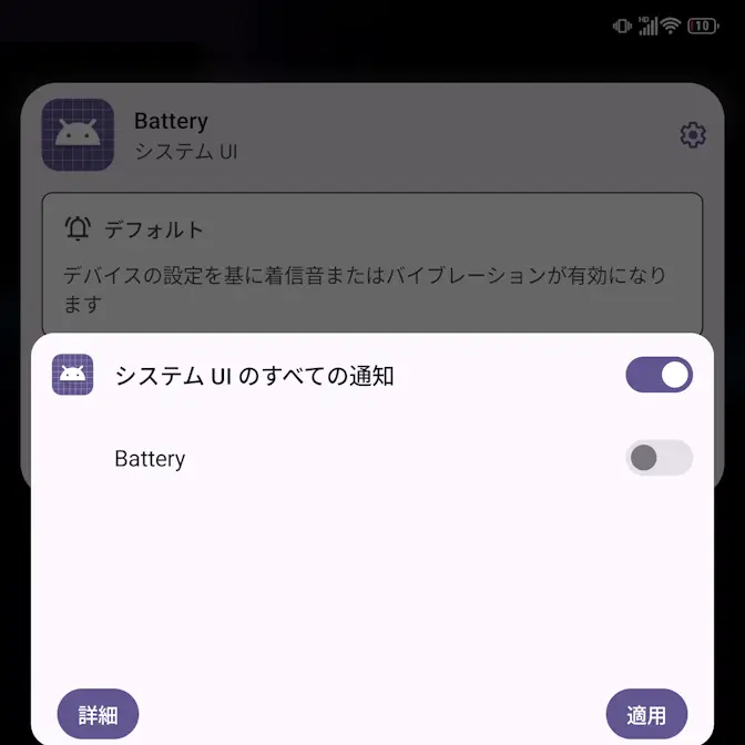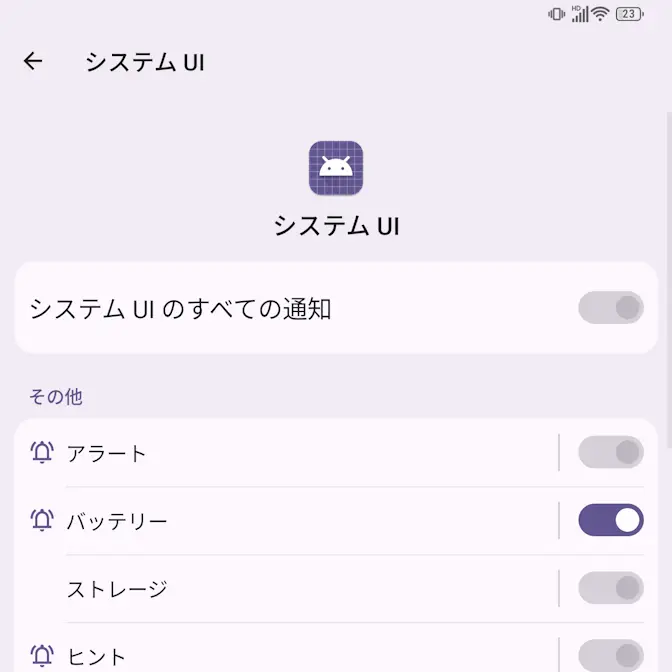 この通知はシステムUIと呼ばれるアプリによって表示されており、通知よりOFFに切り替えれば表示しないようにできます。また、元に戻すには設定より操作します。