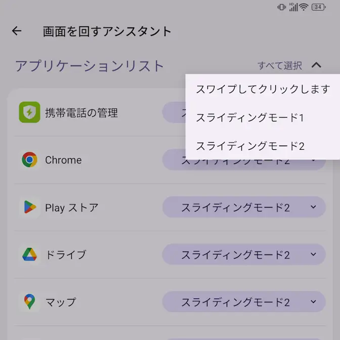 キーボードのジェスチャーのアプリケーションリストよりスライディングモード1スライディングモード2またはスワイプしてクリックしますを選択します。