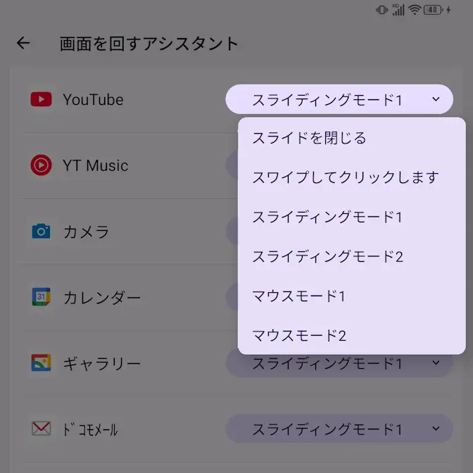 キーボードのジェスチャーのアプリケーションリストよりスワイプしてクリックしますスライディングモード1スライディングモード2またはマウスモード1マウスモード2を選択します。