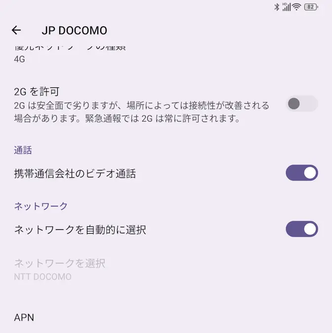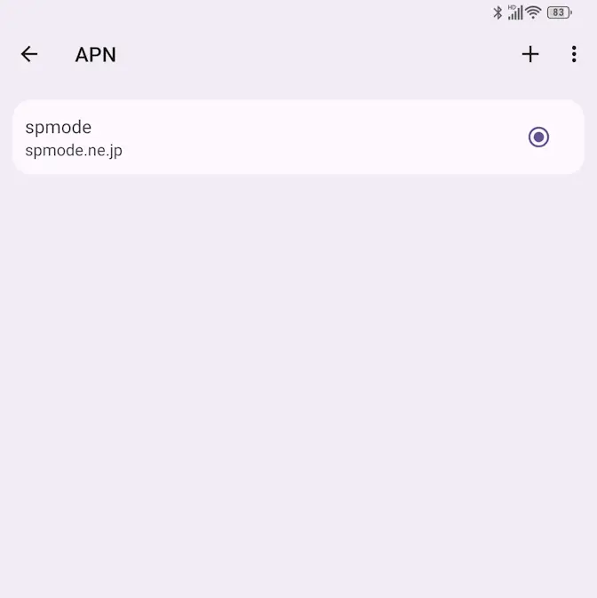 NTTドコモでは取り扱っていないのでAPNの設定が必要かと思いきや、spmode.ne.jpがプリセットされ選択されていましたが、「つながらない」などの場合には確認します。