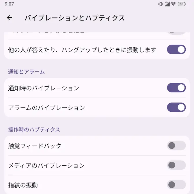 また、指紋認証したときの振動は指紋の振動を、動画や音楽の再生に合わせた振動はメディアのバイブレーションオフすると振動しなくなります。