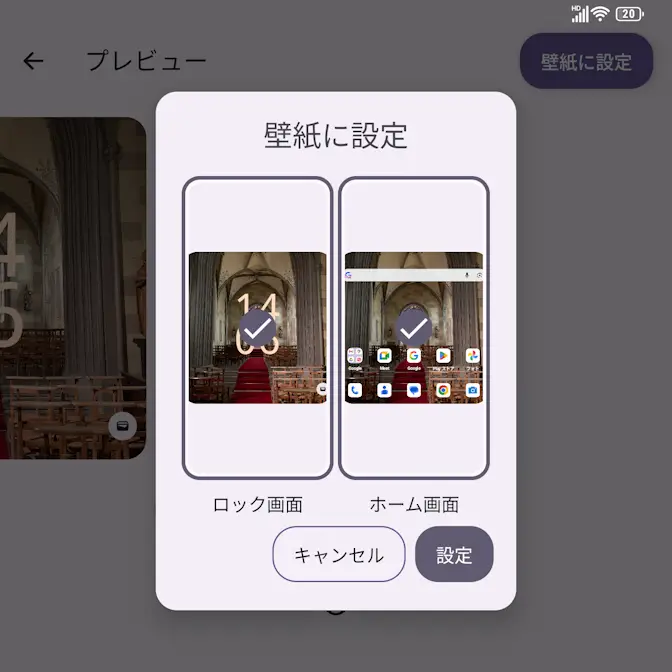 プレビューを確認し壁紙に設定よりロック画面ホーム画面を選択したら確認をタップします。
