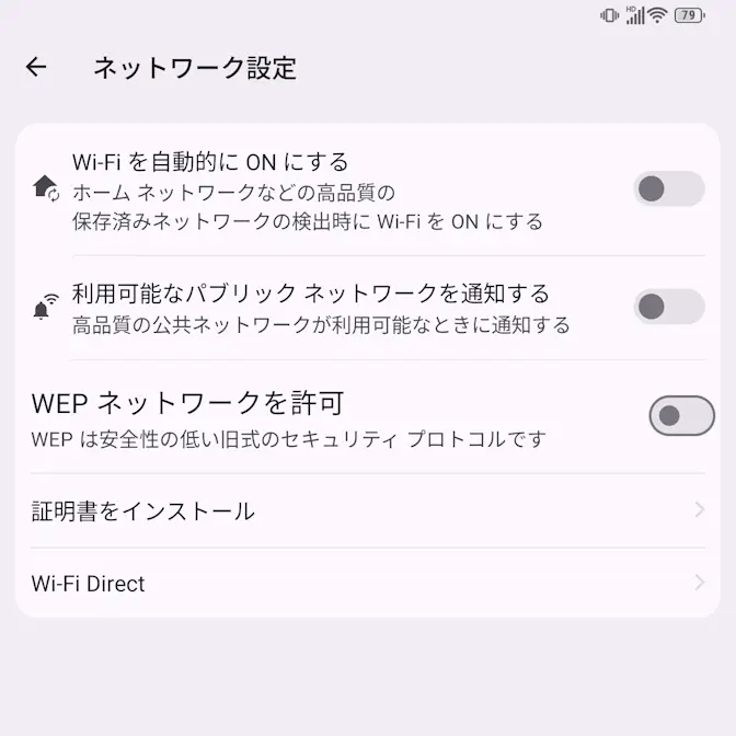 ただ、設定によってオン/オフができるようになっており、特に理由が無ければWEPネットワークの許可をオフにしますが、Titan 2はWi-Fiの設定が一般的なAndroidスマートフォンと異なります。