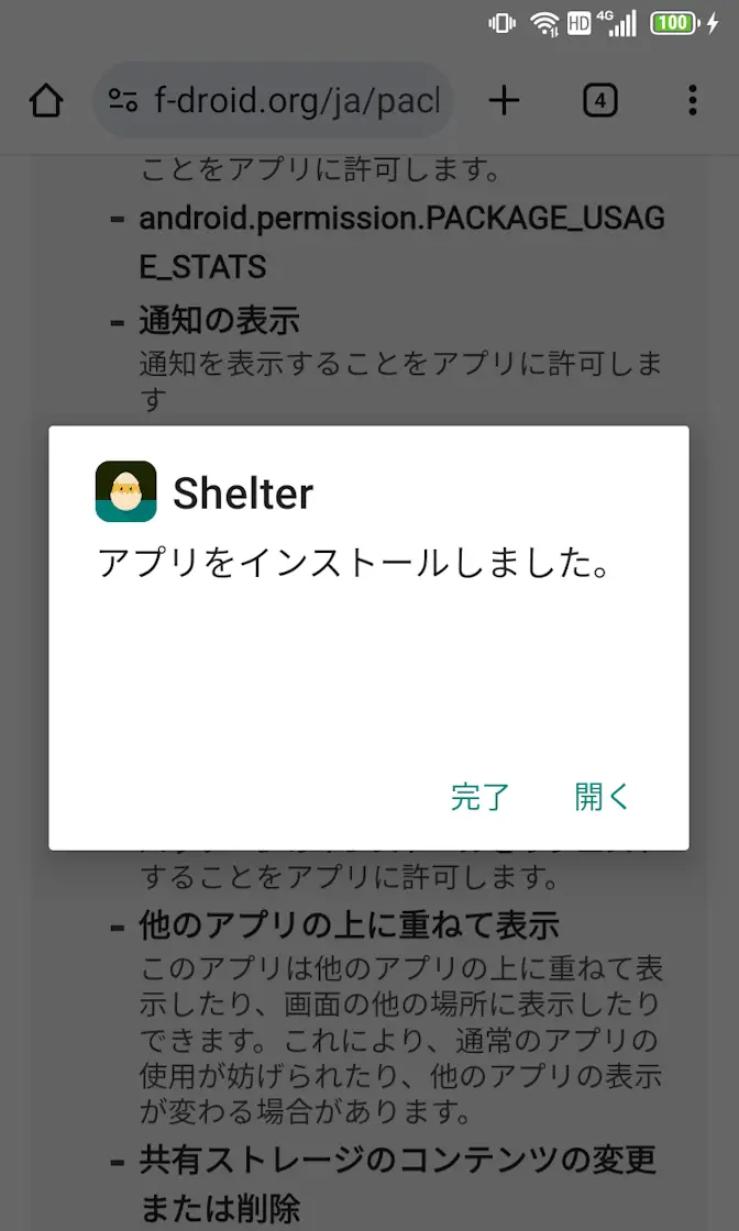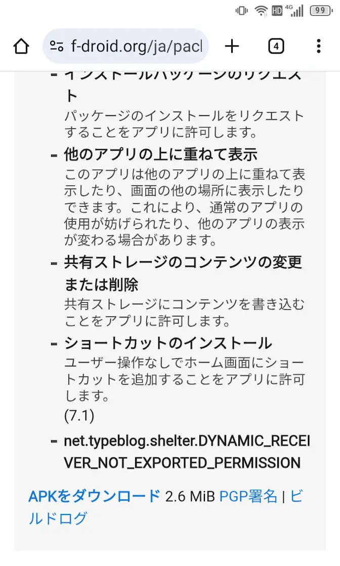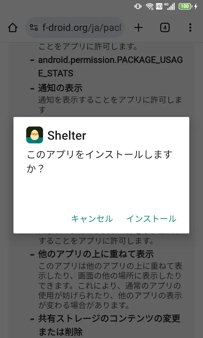 ただし、ShelterアプリはGoogle Playに掲載されておらずF-Droidから手動でダウンロード&インストールします。