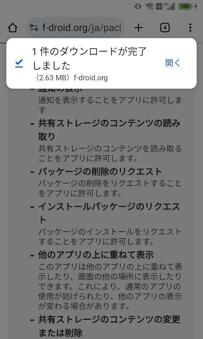 ダウンロードが完了したら開くをタップし、ダウンロードより〇〇.apkをタップします。