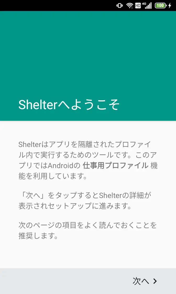 Shelterへようこそより次へをタップし、仕事用プロファイルを設定しましょうより同意して続行>次へをタップします。