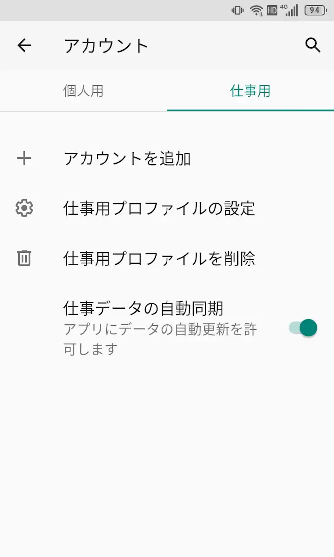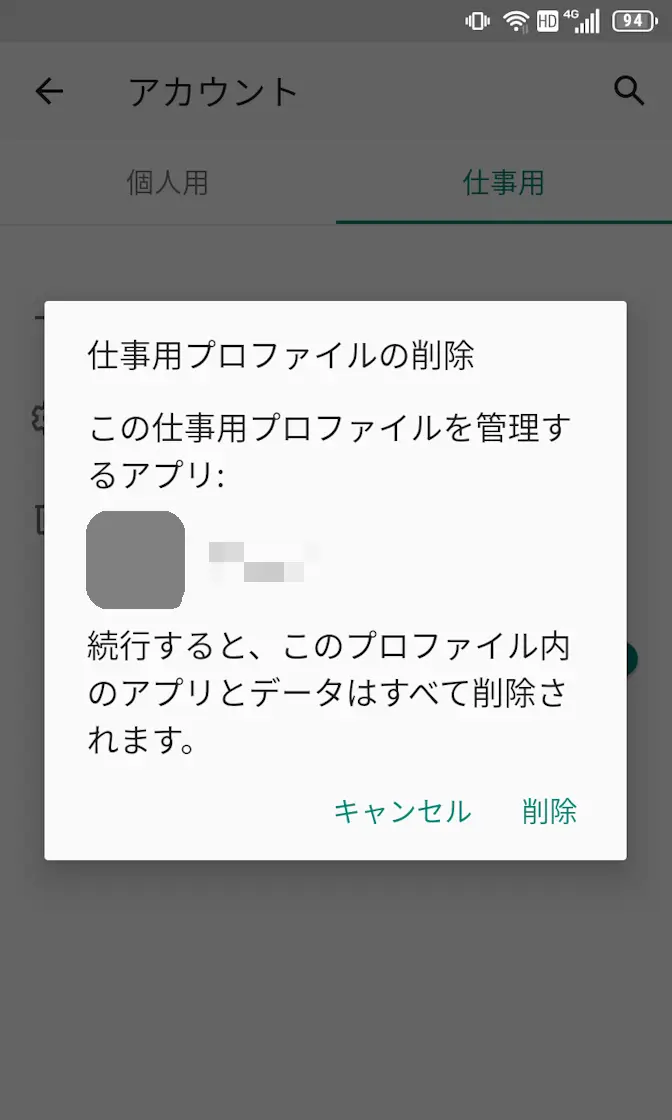 アカウントの仕事用より仕事用プロファイルを削除>削除をタップします。