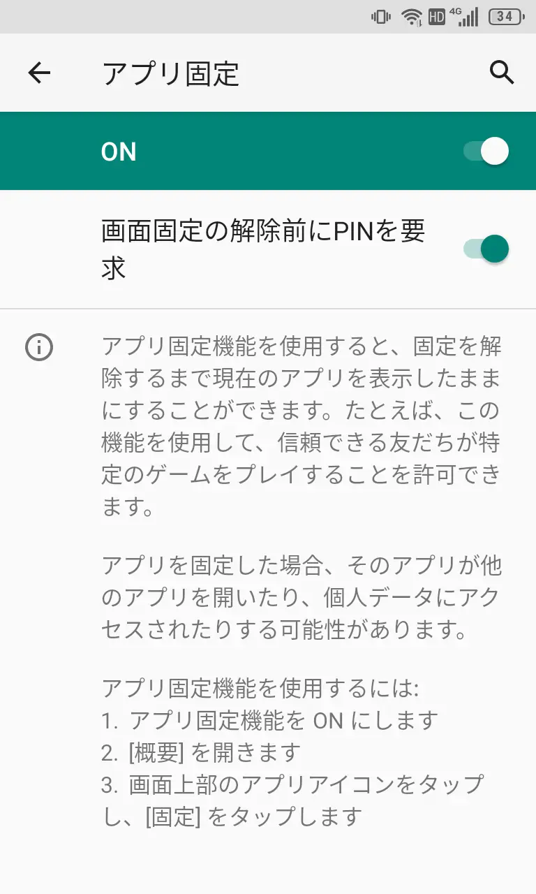 アプリ固定をONに切り替えた際に画面固定の解除前にPINを要求をオンした場合はロック画面が表示されます。