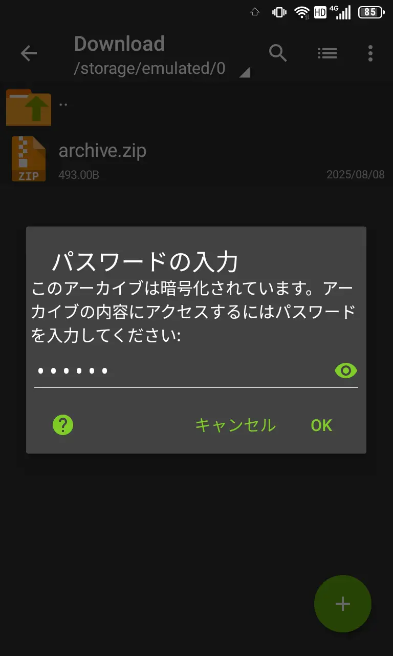 Androidアプリ→ZArchiver→ZIPファイル→メニューAndroidアプリ→ZArchiver→ZIPファイル→パスワードの入力
