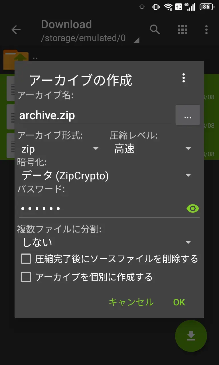 アーカイブの作成よりアーカイブ名アーカイブ形式暗号化パスワードなどを入力/選択しOKをタップすると作成されます。