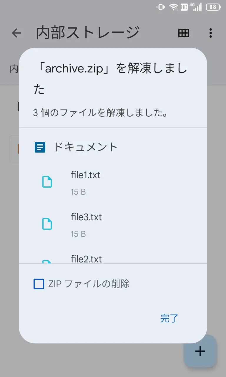 などをタップして任意のフォルダーに移動し解凍をタップすると対象のファイルが展開されます。