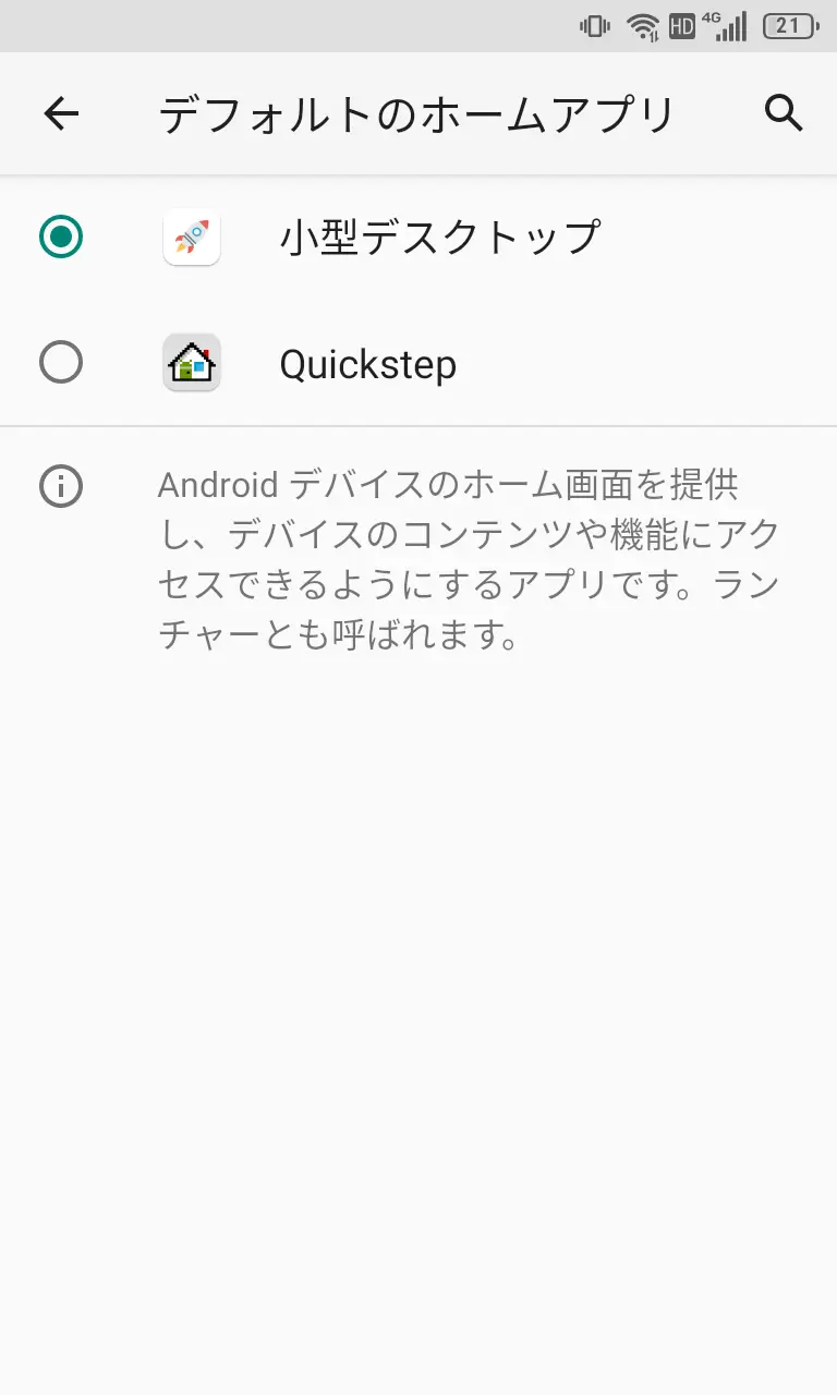 デフォルトのホームアプリより小型デスクトップをタップして選択すると、ホーム画面が切り替わります。