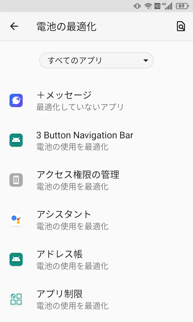 電池の最適化より最適化していないアプリ>すべてのアプリに切り替え、対象のアプリより最適化しないを選択し完了をタップします。
