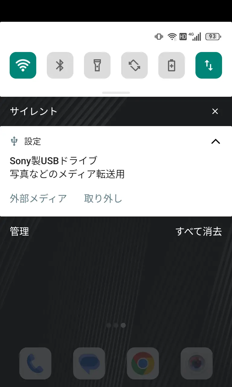 通知領域の〇〇製USBドライブより取り外しをタップするか、設定のストレージ>〇〇製USBドライブより⏏をタップしてから外部ストレージを取り外します。