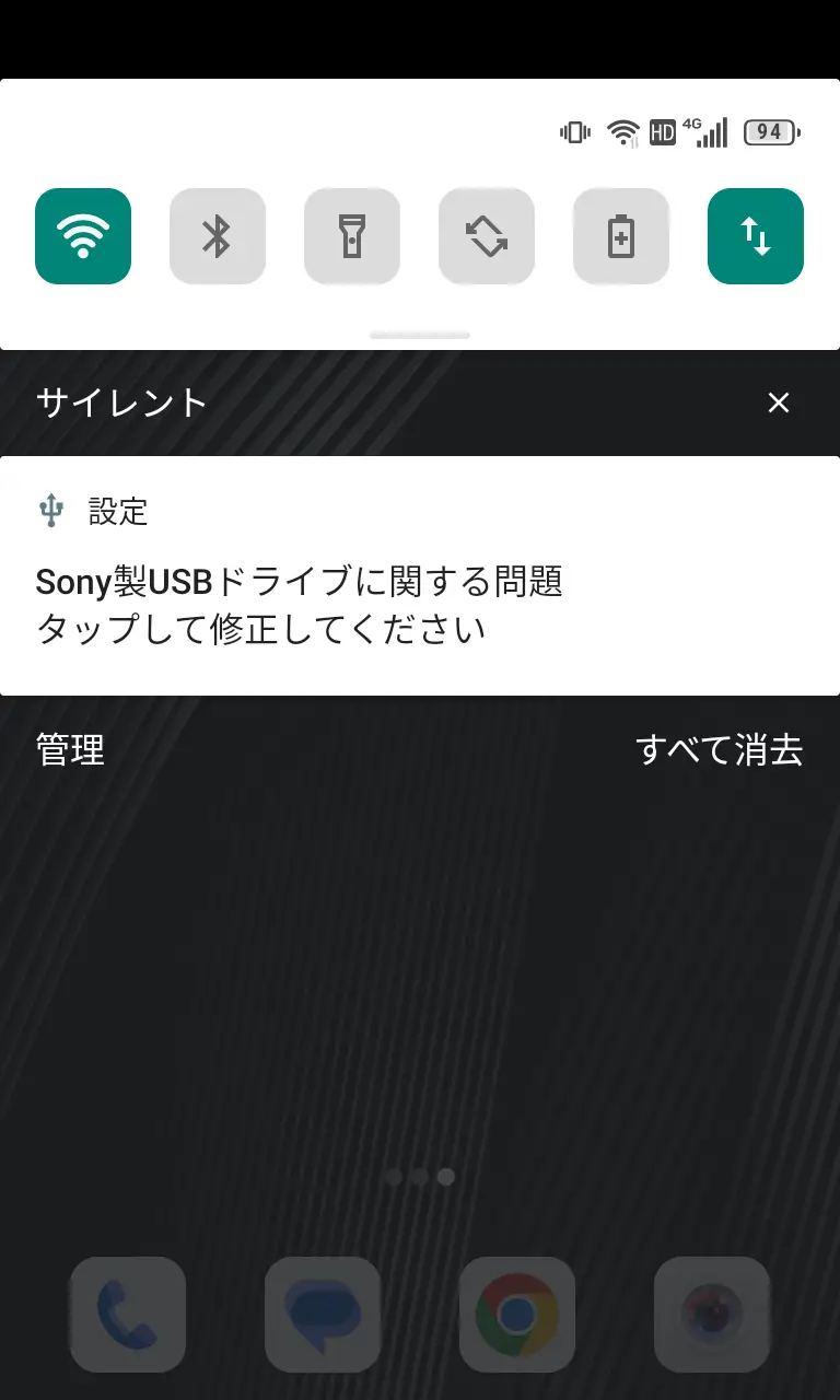 外部ストレージを接続した際、通知領域に〇〇製USBドライブに関する問題 – タップして修正してくださいと表示されることがあります。