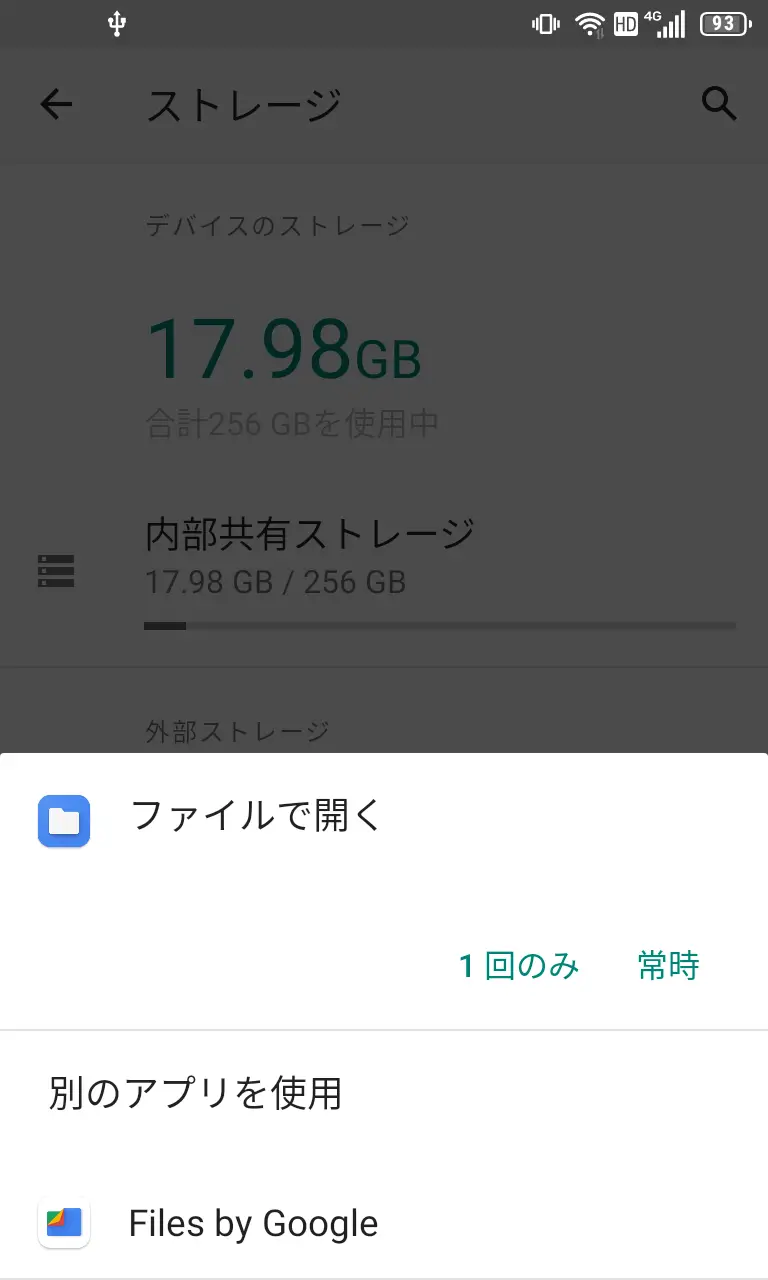 メニューが表示されたらファイルまたはファイルで開くより1回のみ/常時をタップします。