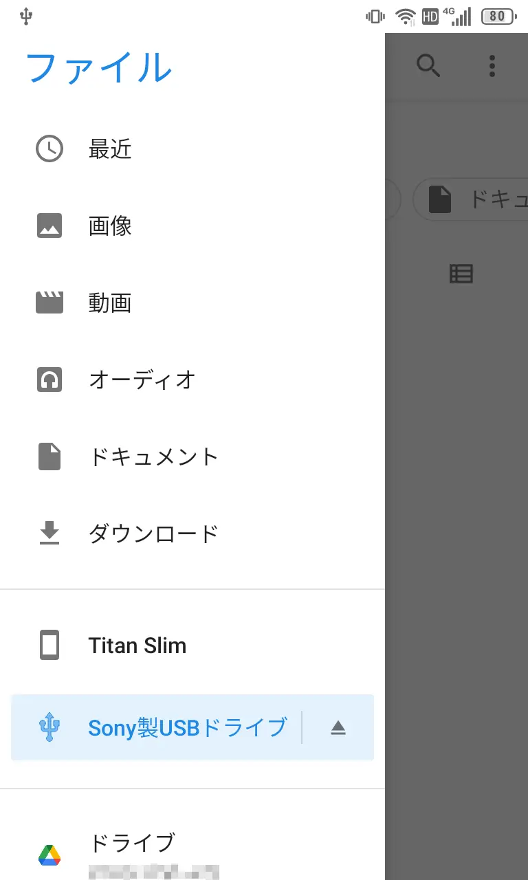 また、内部ストレージに切り替えるには三よりTitan Slimをタップし、外部ストレージに切り替えるには〇〇製USBドライブをタップします。