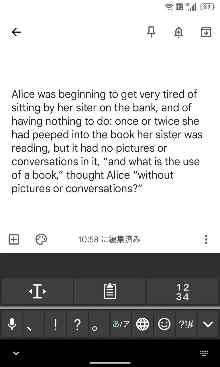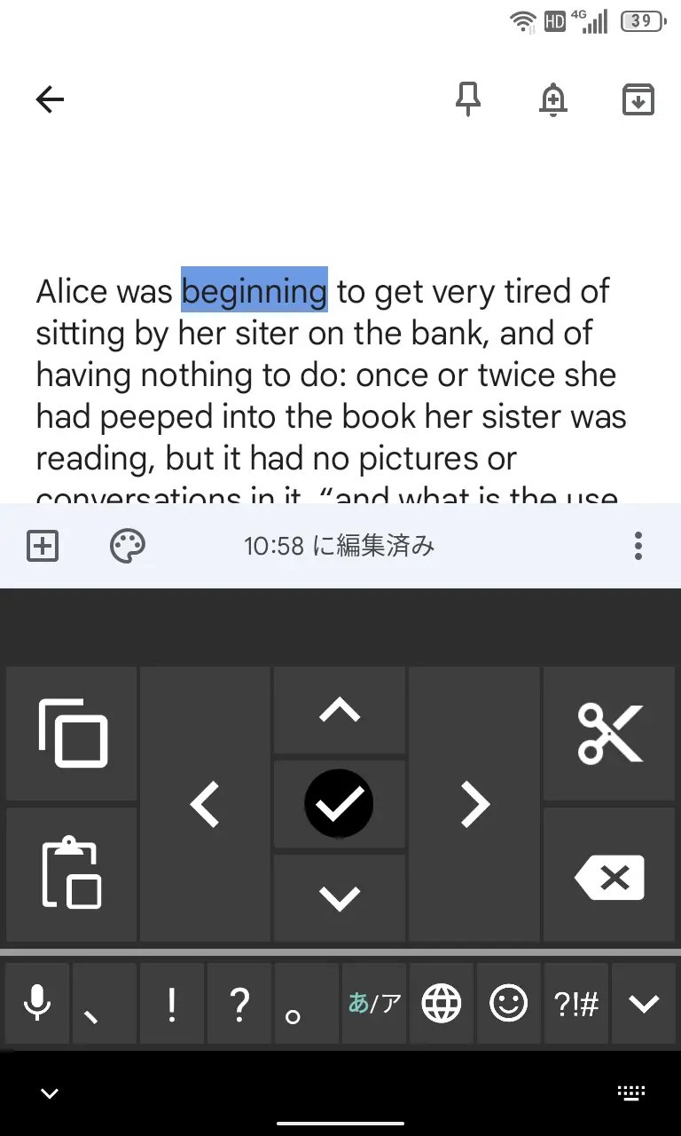 Titan SlimのQWERTY物理キーボードには[←][→]のようなカーソルを動かすキーが搭載されていないので、ドラッグするか画面キーボードを表示して上下左右にカーソルを移動します。