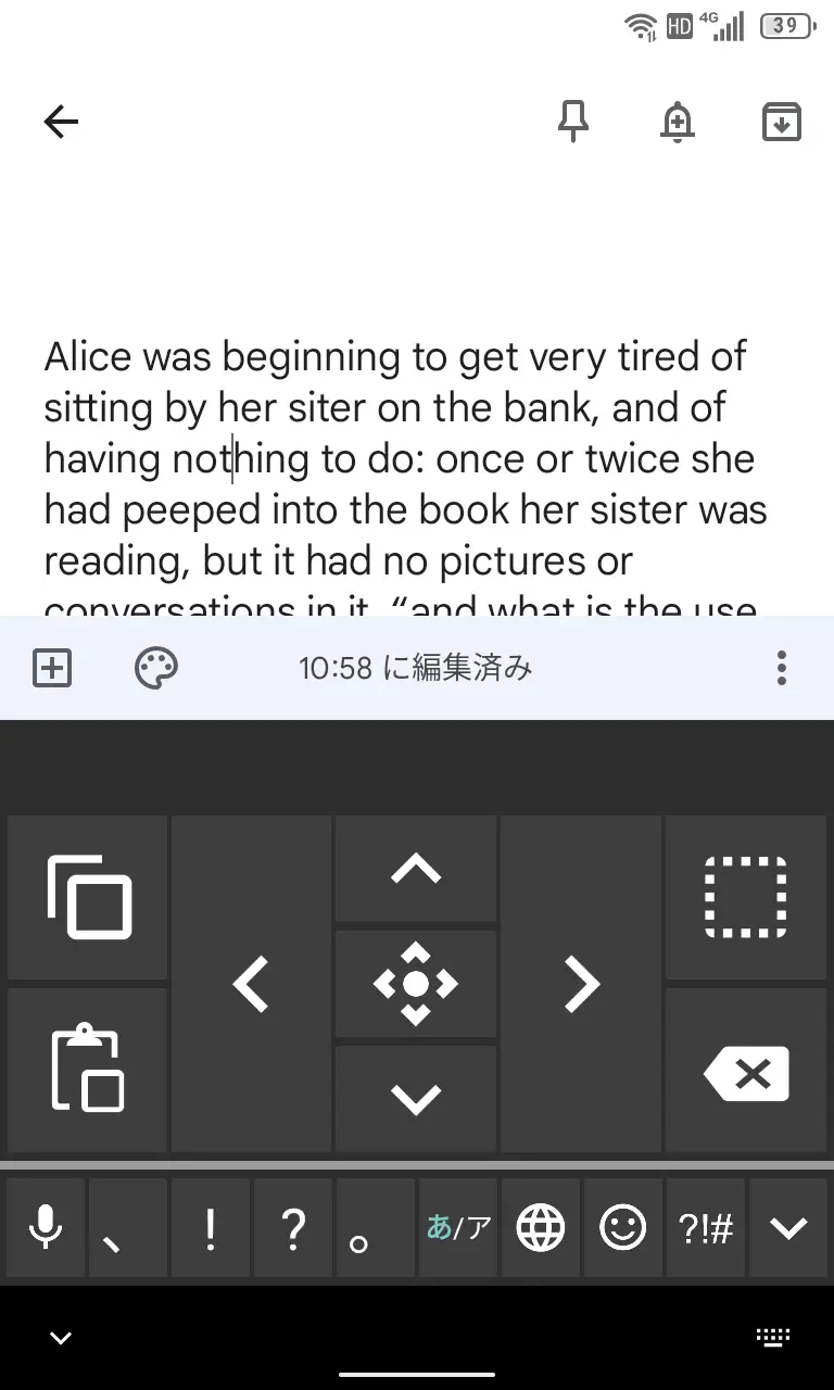 Androidスマートフォンの画面キーボード(Gboardなど)には◀/▶などカーソルキーが表示されていることが多いので、入力位置を変更するためのカーソル移動は容易です。
