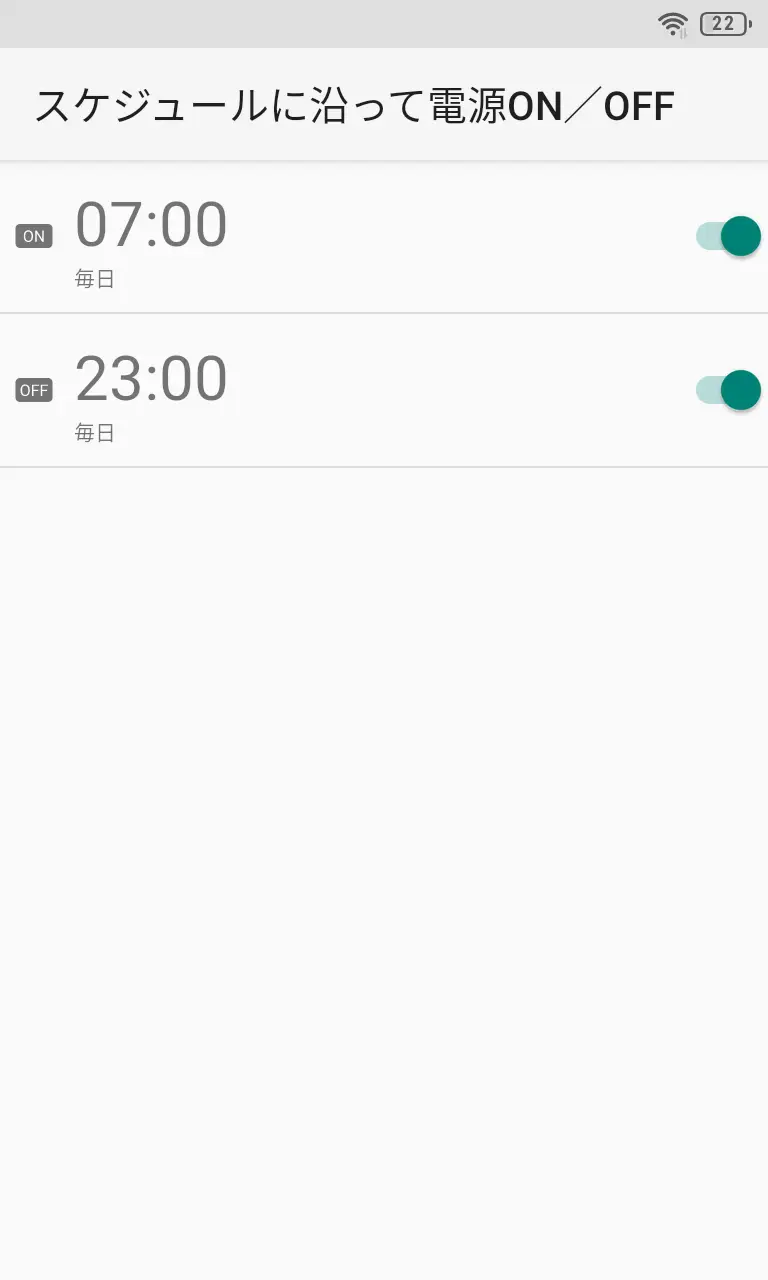 ただ、試したところオフ/オンの間隔が短いと電源を自動でオンにするが動作しないようなので、5分程度は開けた方が良いです(オフが23:00であれば、オンは23:05など)。