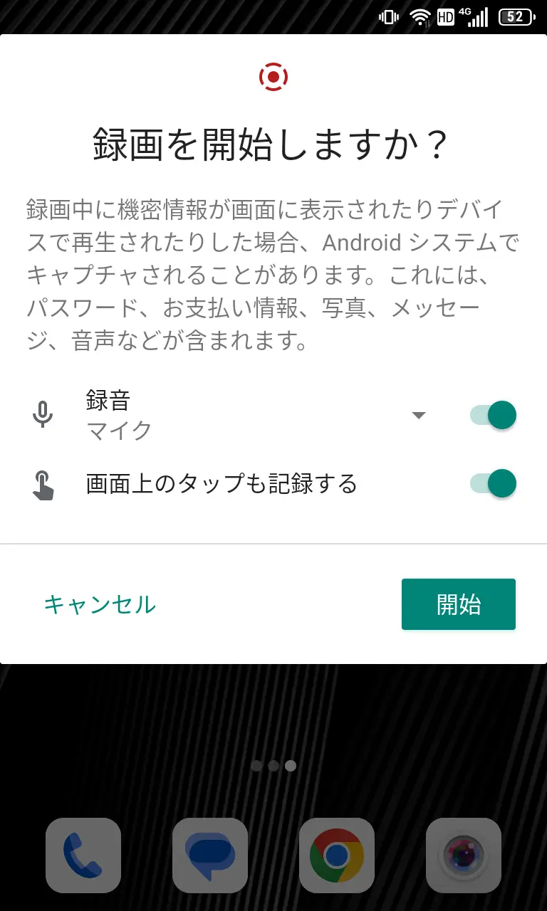 クイック設定ツールスクリーンレコード – 開始より録音画面上のタップも記録するのオン/オフを選択し開始をタップします(画像はオンの状態)。